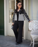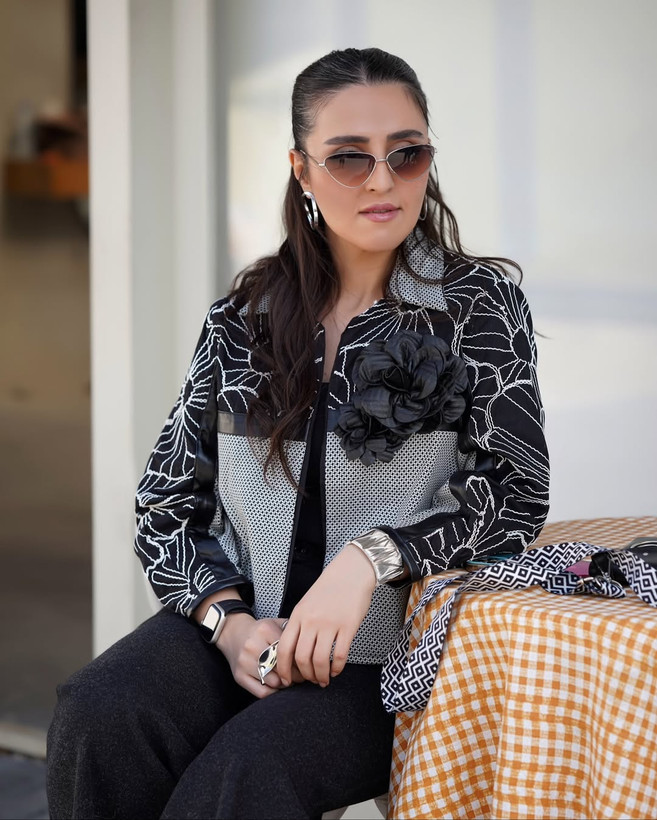 کتوشلوار زنانهای با ترکیب خاص پارچهی شنل کره و شانا قیطوندوزی، همراه با نوار چرمی دوزیشده و اکسسوری گل چرمی دستساز برای خانمهایی که میخوان استایلشون ترکیبی از ظرافت، قدرت و لوکس بودن باشه.
