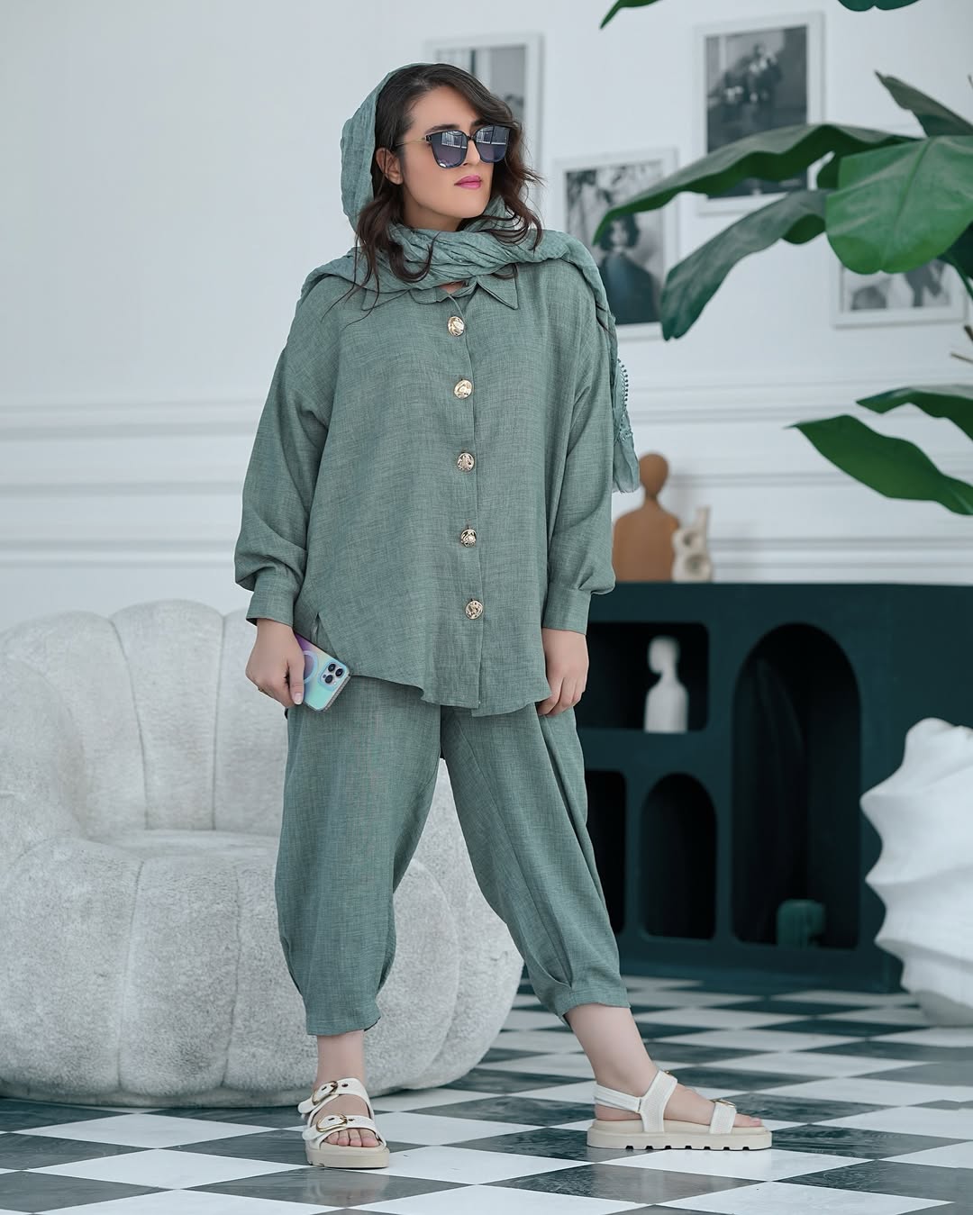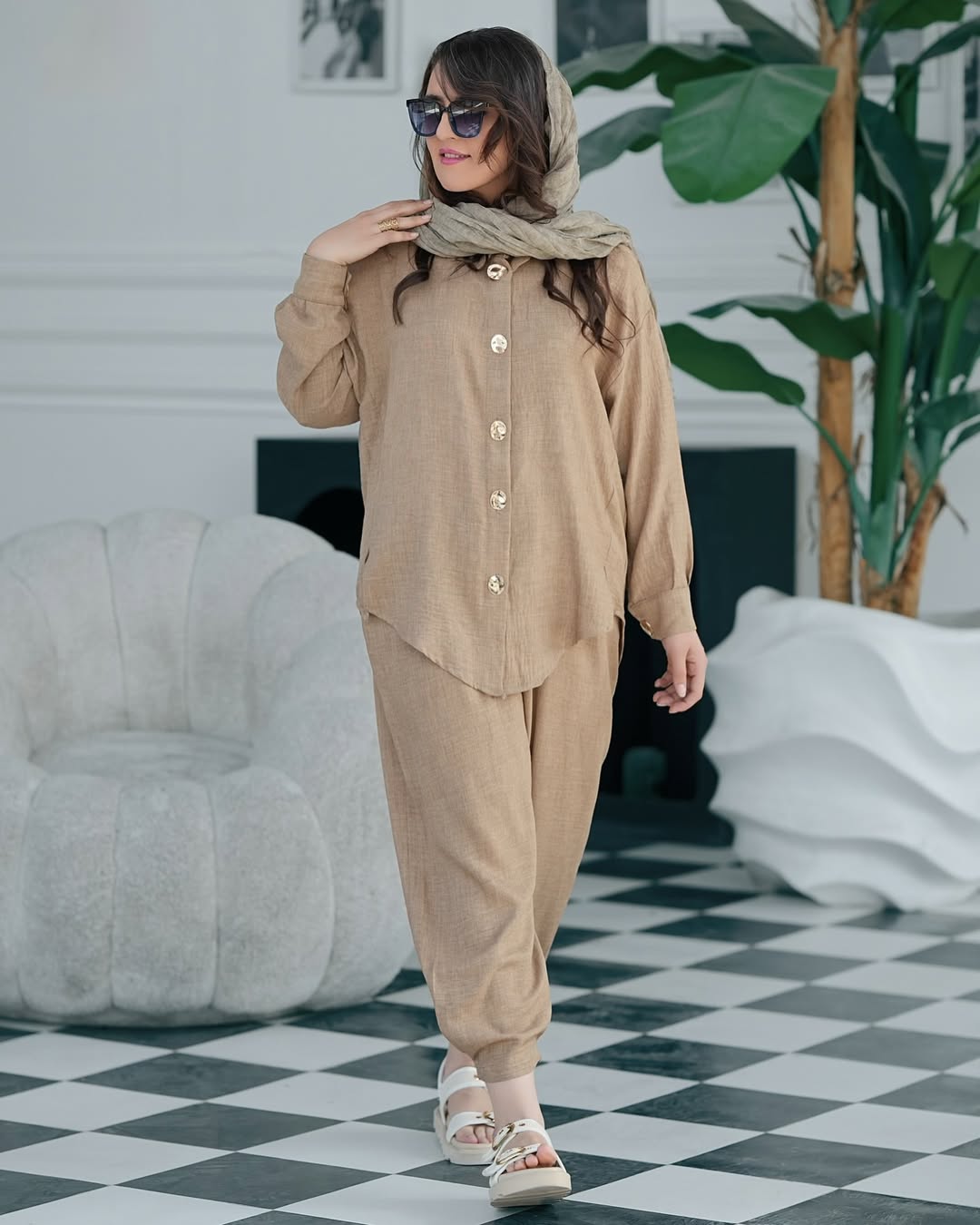 فاق شلوار بلنده و کمرش کاملا کشه خیلی راحت میتونی قد شلوار رو خودت تنظیم کنی. از جنس سبک و خنک به همراه دکمه های فلزی وارداتیش.
