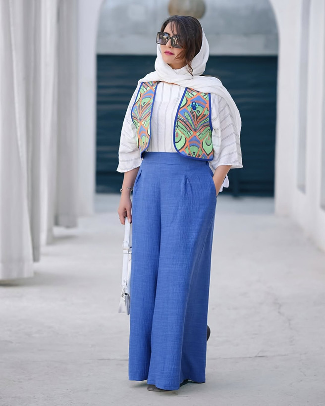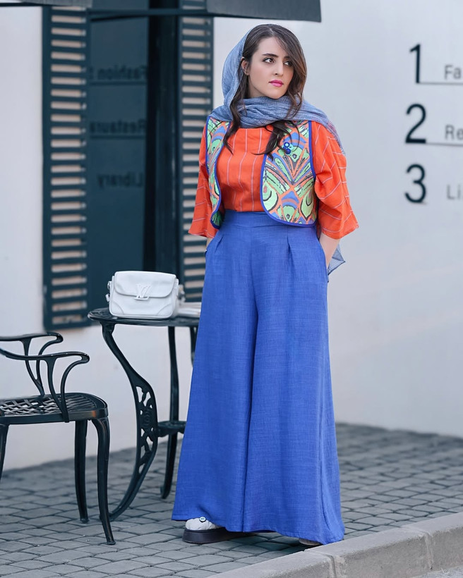 این ست شامل شومیز لینن یاخما با دورنگ نارنجی وسفید، وست ژاکارد وارداتی و شلوار لینن لوک کُره ای است.