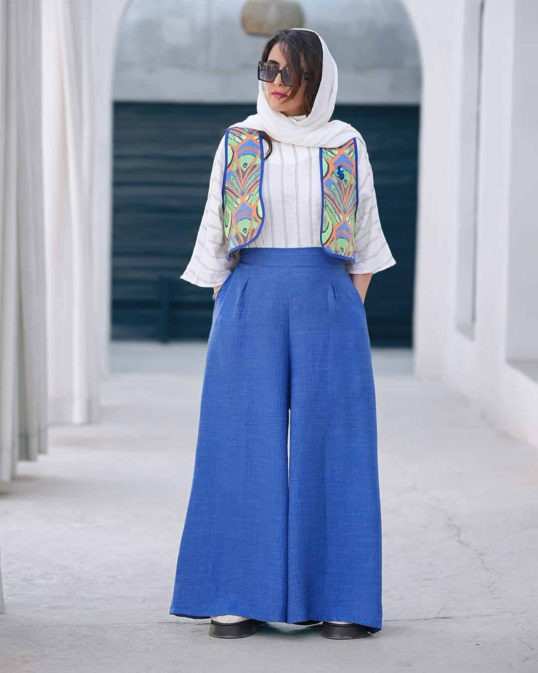 این ست شامل شومیز لینن یاخما با دورنگ نارنجی وسفید، وست ژاکارد وارداتی و شلوار لینن لوک کُره ای است.